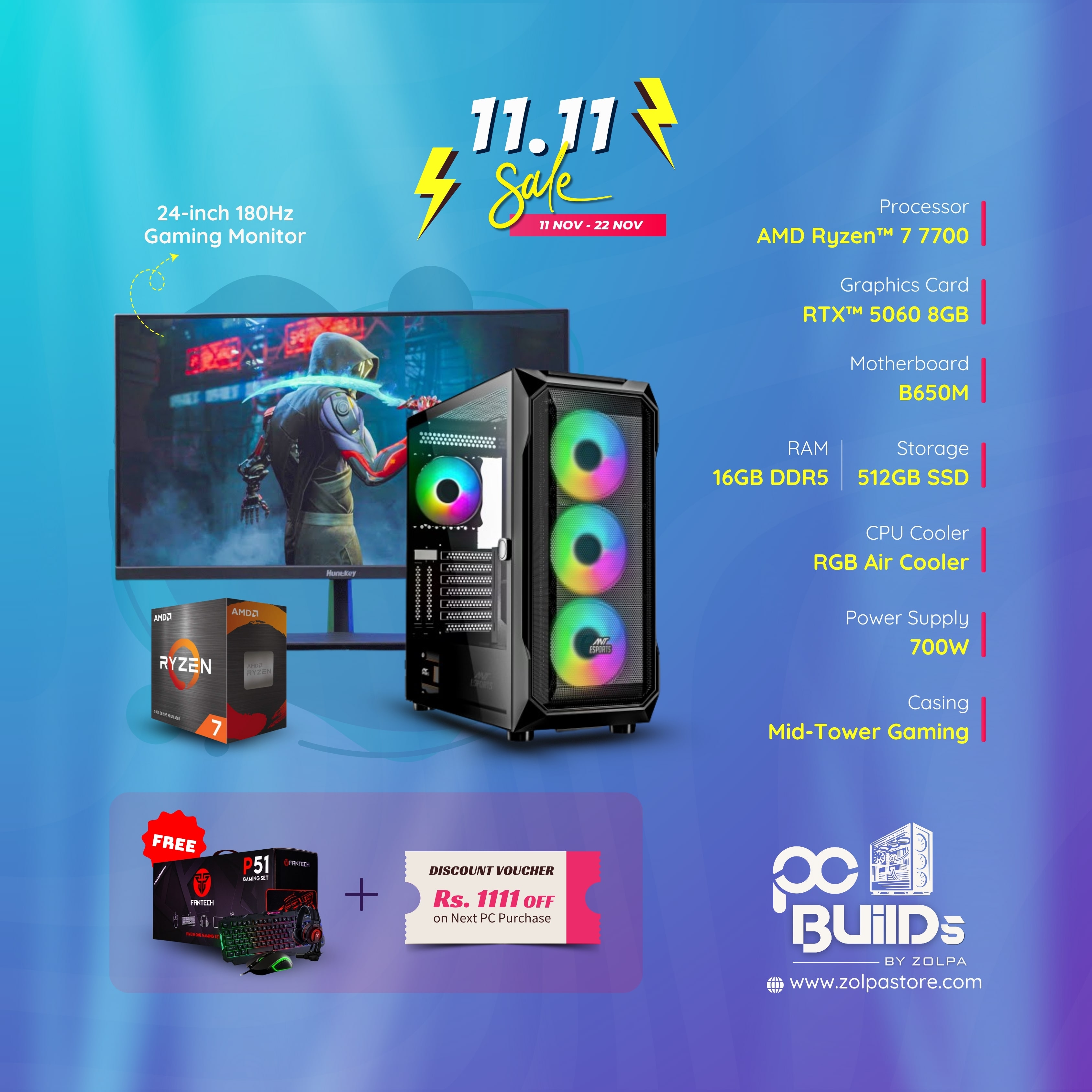 Gaming PC Build | AMD Ryzen 7 7700 Processor | 16GB DDR5 RAM | 512GB SSD | NVIDIA GeForce RTX 5060 8GB Graphics | B650M Motherboard | RGB Air CPU Cooler | 700W Power Supply | Mid Tower Case.