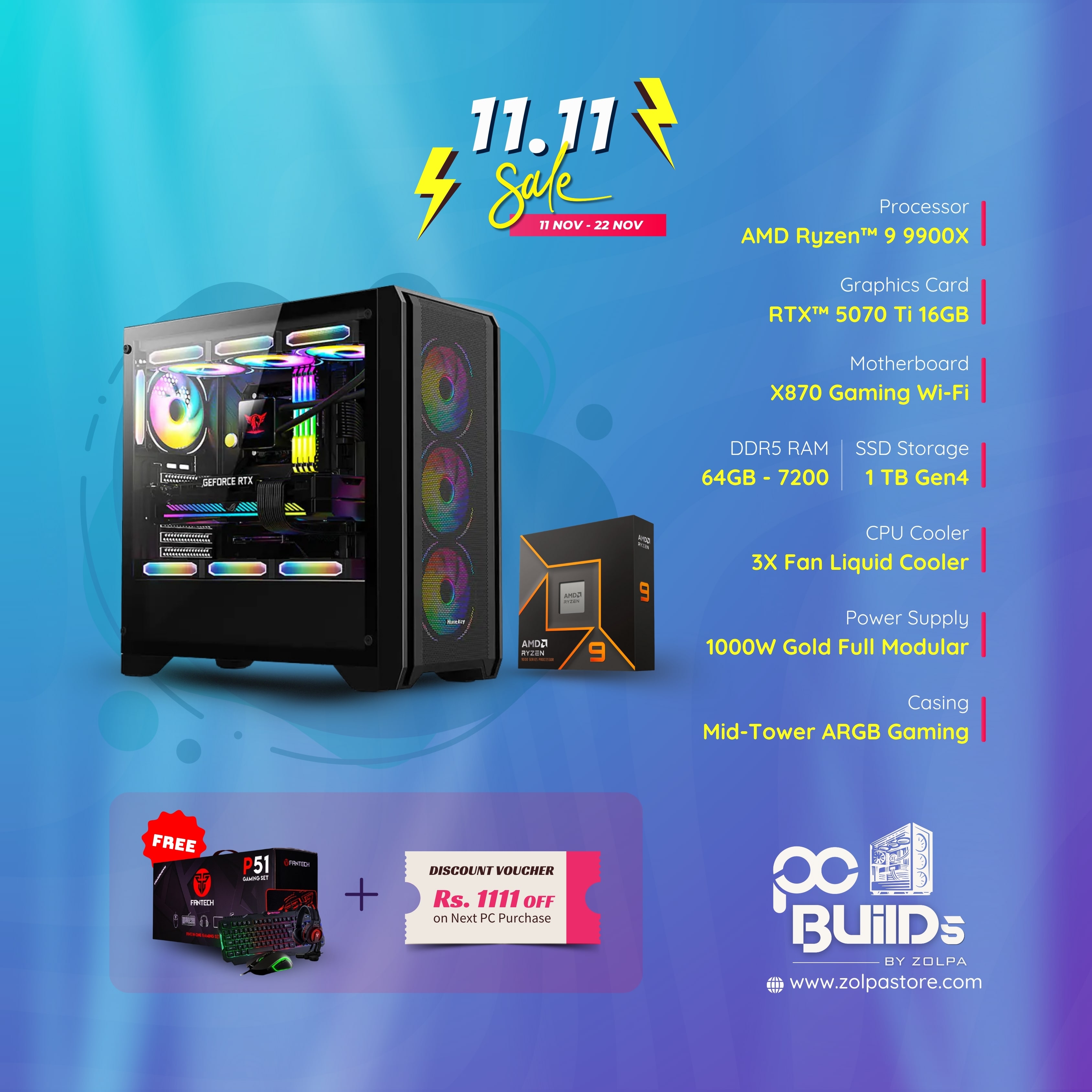 Gaming PC Build | AMD Ryzen 9 9900X Processor | 64GB DDR5 RAM | 1TB SSD | RTX 5070 Ti 16GB Graphics | X870 WiFi Motherboard | 1000W Gold Full Modular PSU | Mid Tower ARGB Gaming Case.