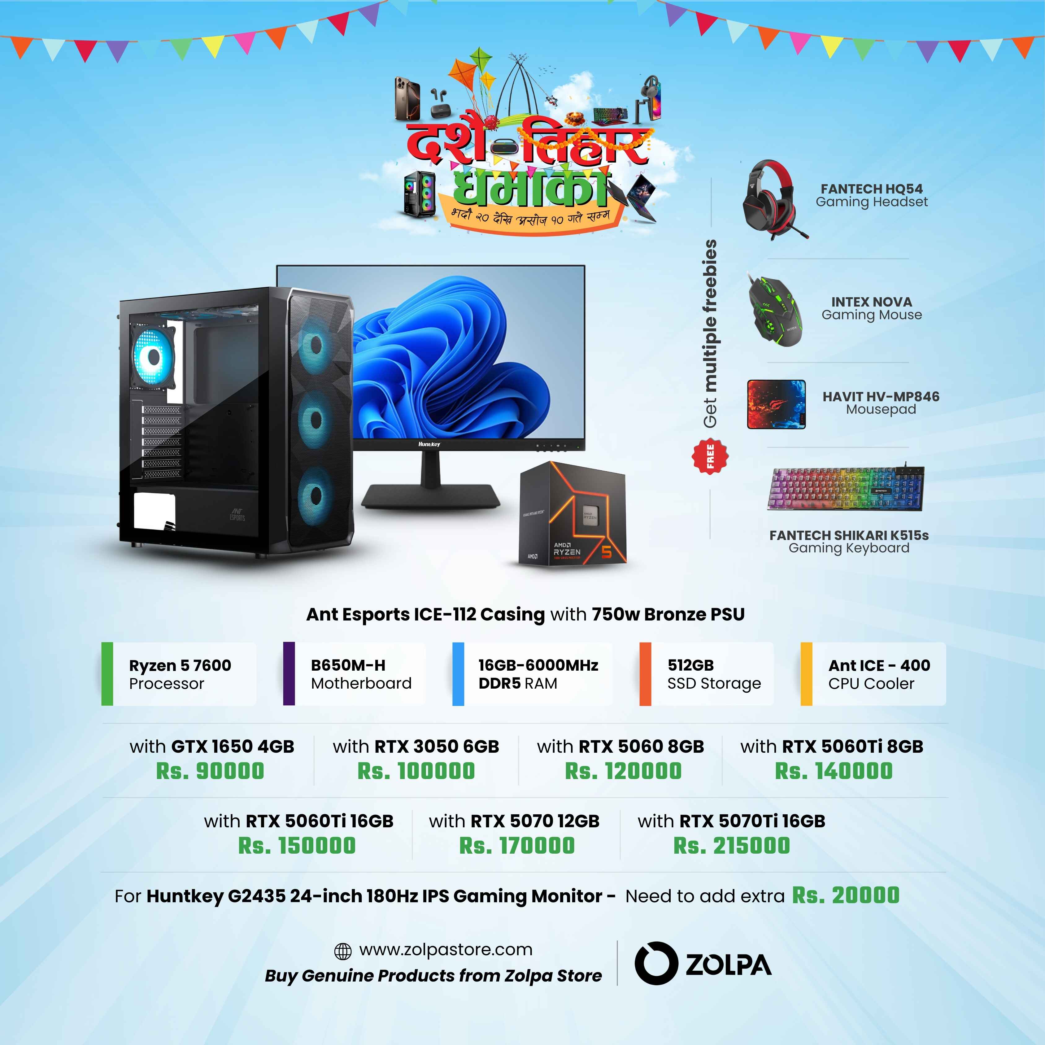 Gaming PC Build | Ryzen 5 7600 Processor | B650M H Motherboard | 16GB DDR5 6000MHz RAM | 512GB SSD | Ant ICE-400 CPU Cooler | Ant Esports ICE-112 Casing with 750W Bronze PSU.