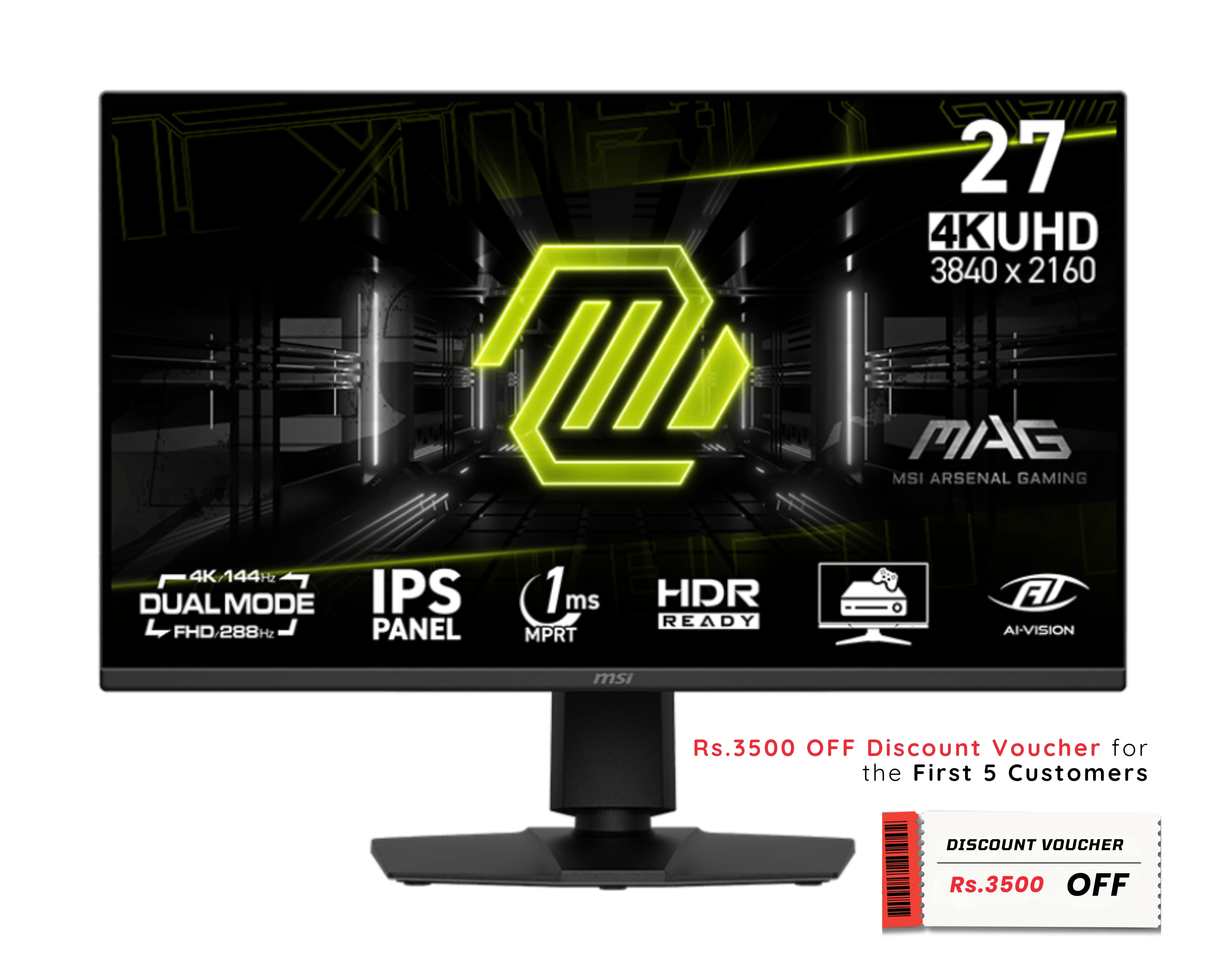 MSI MAG 275UPD E14 – 27" UHD (3840 × 2160) IPS Ergonomic Flat Gaming Monitor | Dual Mode FHD (1920 × 1080) | 250 nits Brightness | 2×2W Speakers | Adaptive-Sync | 1× DisplayPort 1.4a, 2× HDMI 2.1 (4K @144Hz).