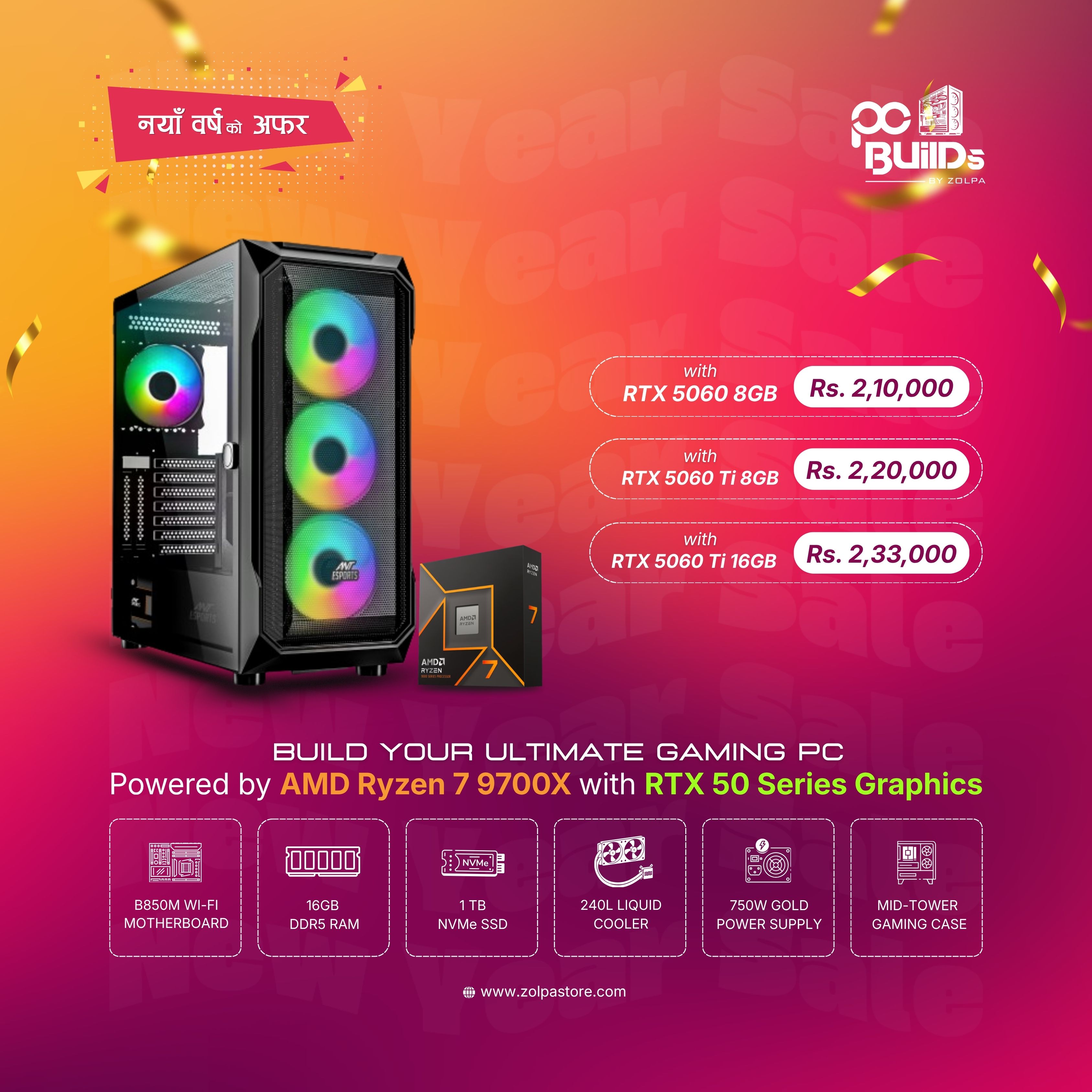 Ultimate Gaming PC | AMD Ryzen 7 9700X (Zen 5) | 16GB DDR5 | 1TB NVMe SSD | B650M Motherboard | 240mm Liquid Cooler | 750W 80+ Gold PSU | Mid-Tower RGB Gaming Case | RTX 50 Series Graphics.