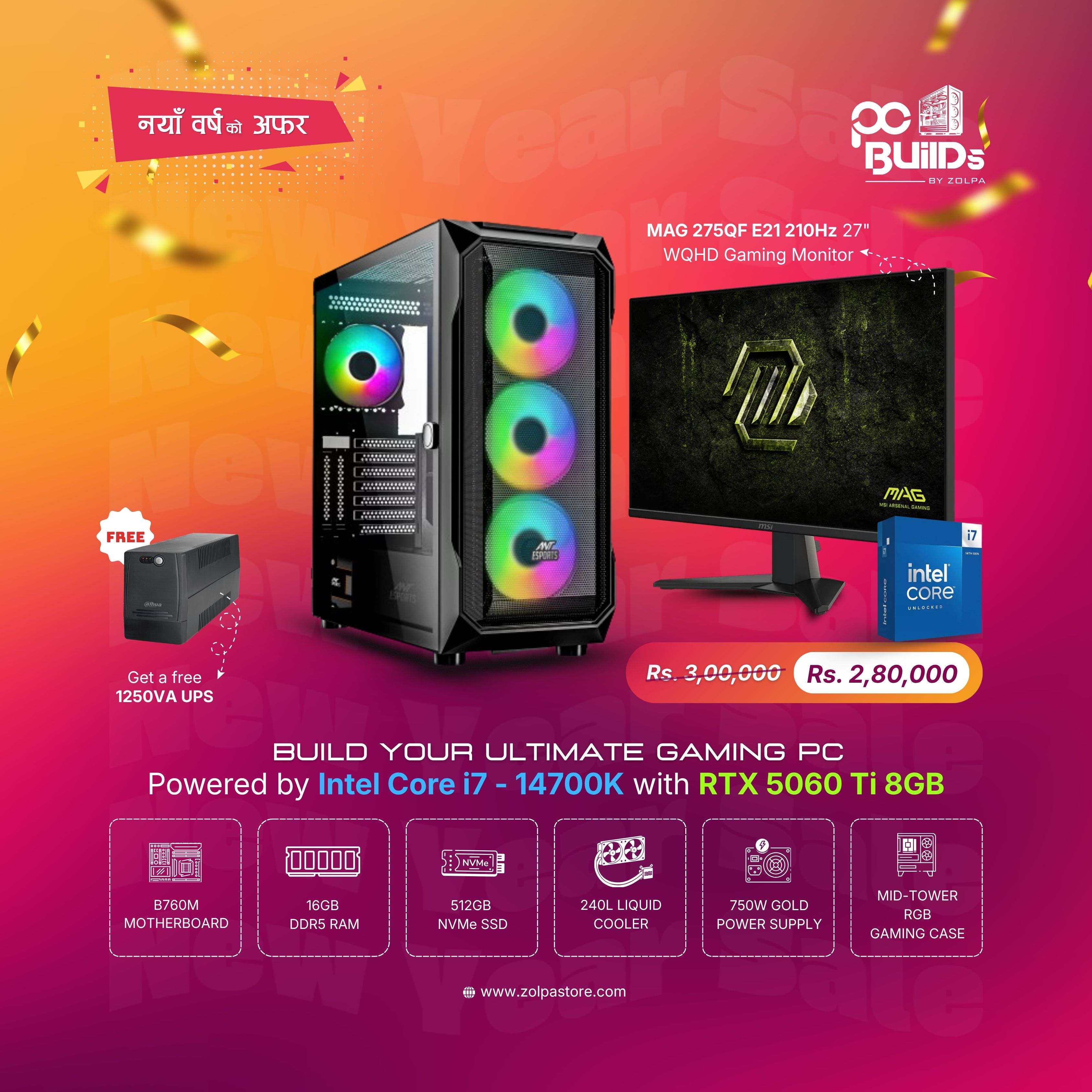 Ultimate Gaming PC | Intel Core i7-14700K Processor | 16GB RAM | 512GB SSD | PNY RTX 5060 Ti 8GB GPU | B760M Motherboard | 240L Liquid Cooler | 750W Gold PSU.